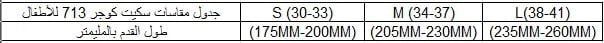 جدول مقاس سكيت كوجر 713 للاطفال لون اسود واللون الابيض من حذاء عجلات للاطفال موديل 713 من كوجر.