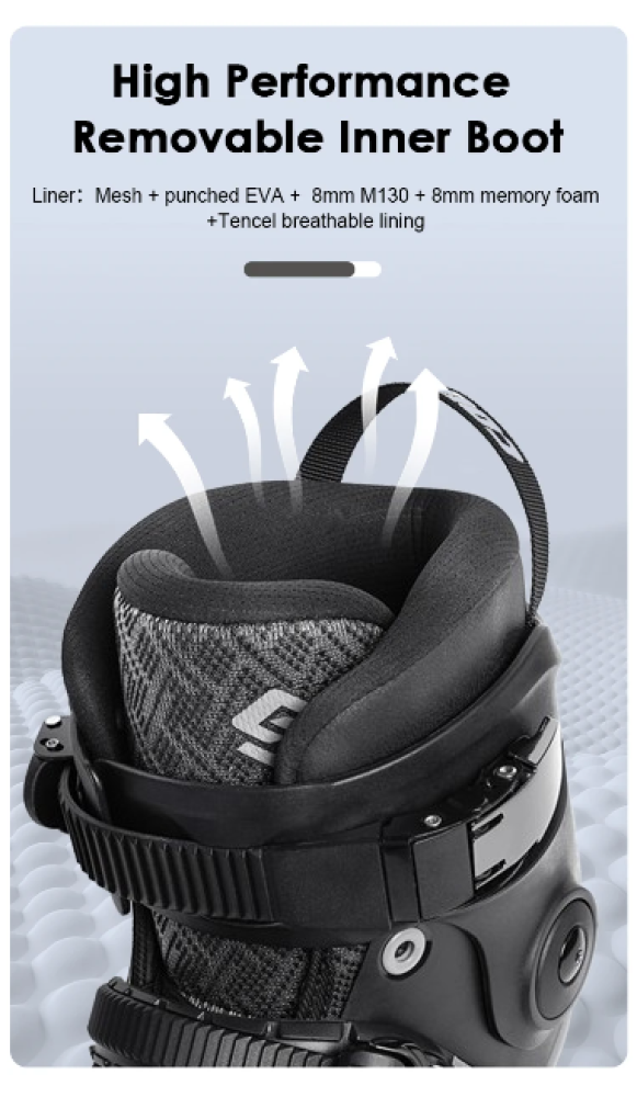 Breathable Hard ShellThe skate features a strong three-dimensional shell with special vents on the sides to keep your feet cool and dry. Made from lightweight PA and GF fiberglass, it is strong and flexible, perfect for extreme sports.